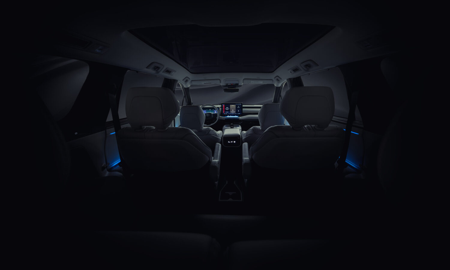 Interiér má zaujať svetlými materiálmi a otvoreným priestorom pod panoramatickou strechou. Na fotografiách vidno šesťmiestne usporiadanie so samostatnými sedadlami v druhom rade, pričom sedemmiestna konfigurácia by mala byť dostupná tiež. Palubná doska kombinuje veľký centrálny displej s digitálnym prístrojovým štítom a fyzickými ovládačmi.